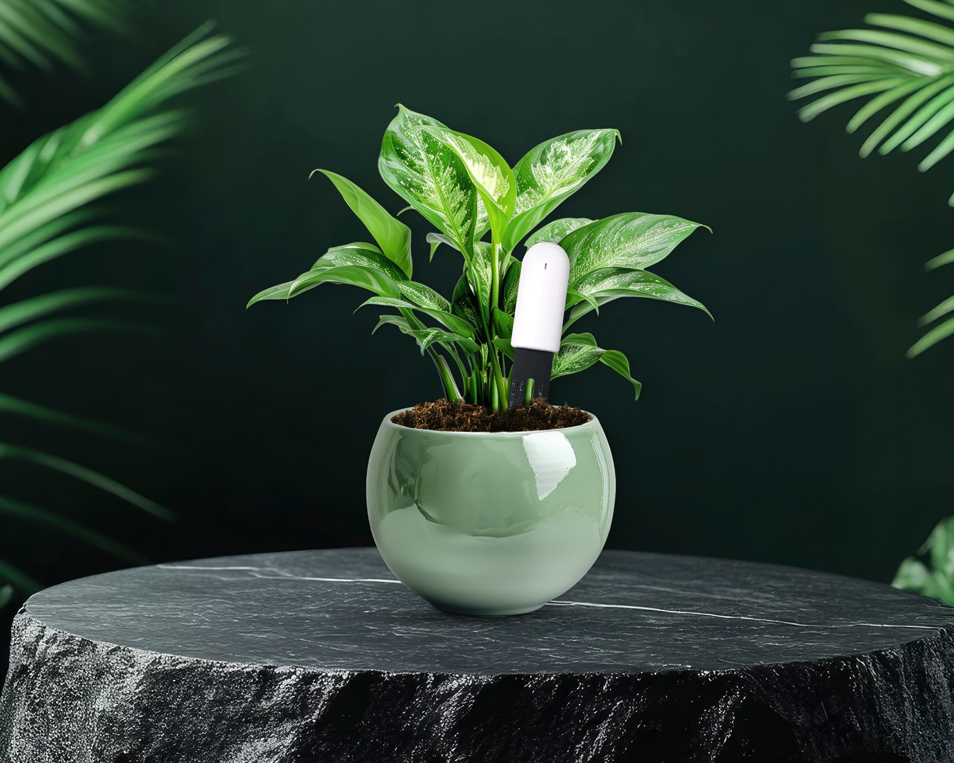 Stecken Sie den Pflanzensensor mit den Metallstiften vollständig in die Erde in der Nähe Ihrer Pflanze.